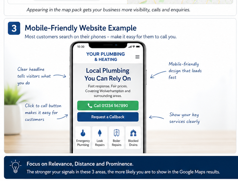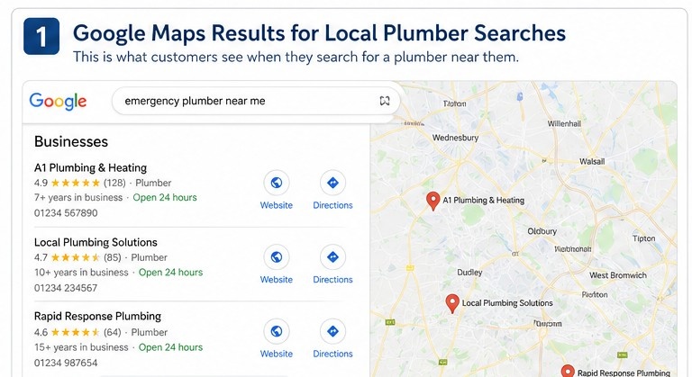 When someone searches for “plumber near me”, “emergency plumber near me”, or “boiler repair in [town]”, they’re usually ready to act. They don’t want to read ten websites. They want someone reliable, nearby, and easy to contact.